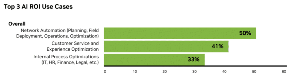 A year later, telco operators identified three top use cases for AI investment. Half of respondents pointed to network automation as a top use case, while 41% identified customer service and 33% cited internal optimizations.